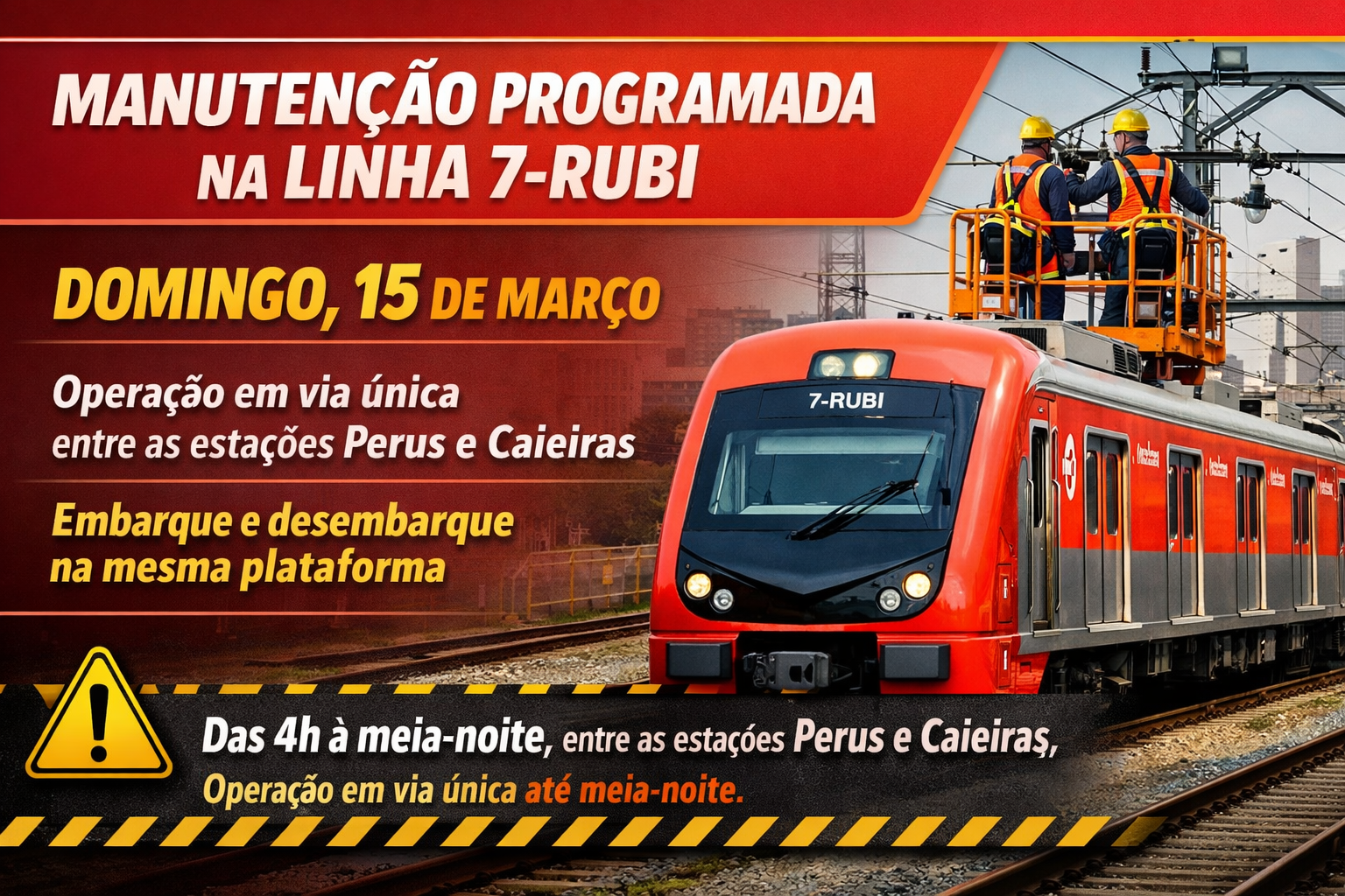 São Paulo, 13 de março de 2026 – A Linha 7-Rubi terá operação diferenciada neste domingo (15), […]